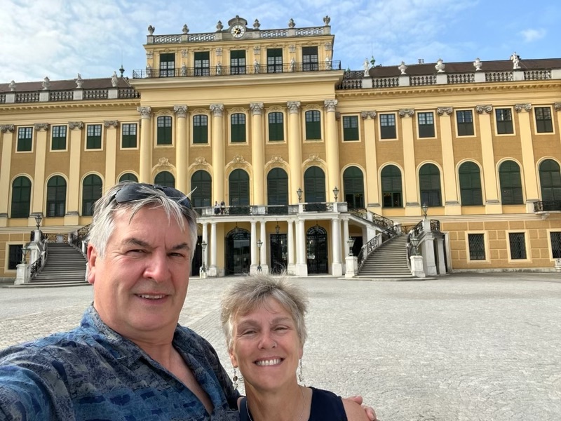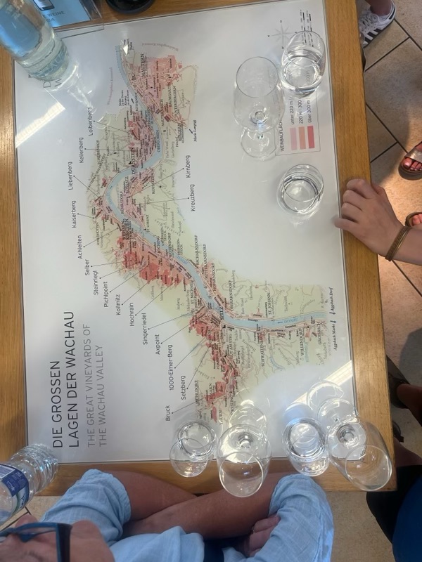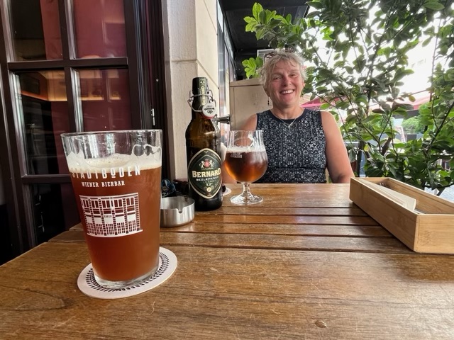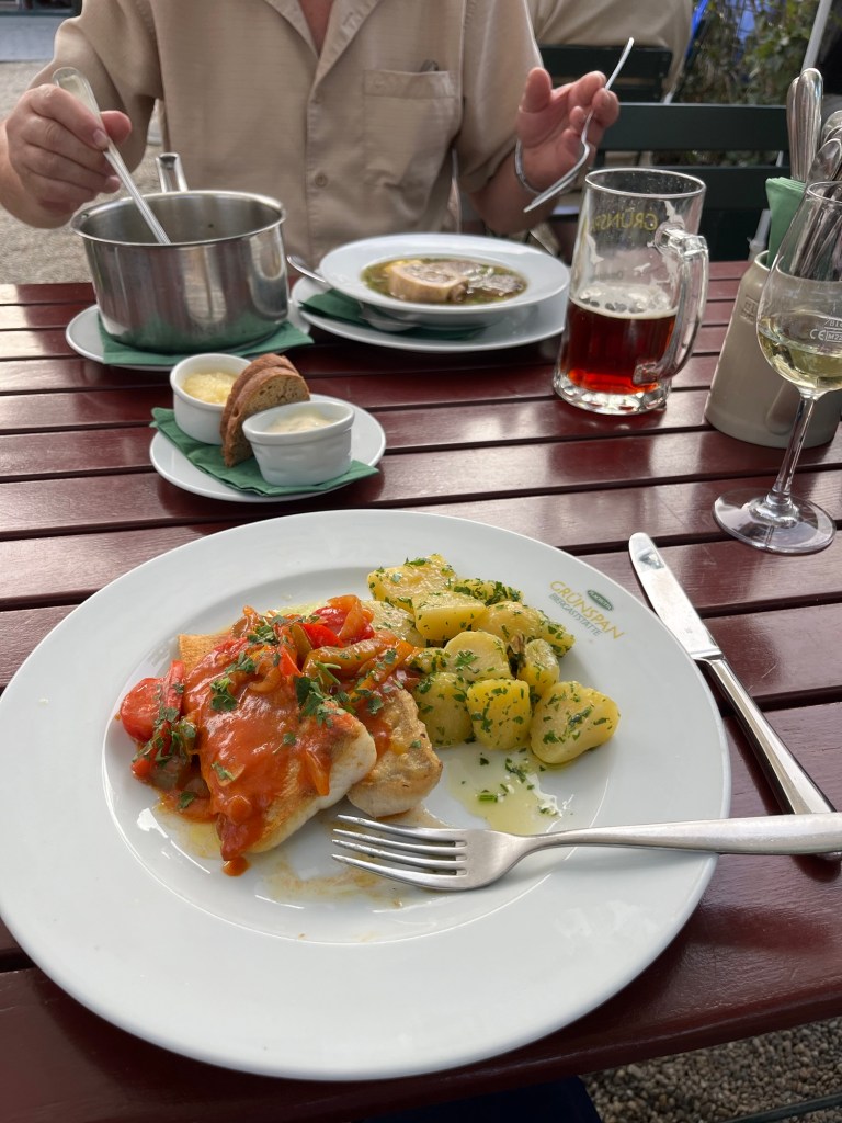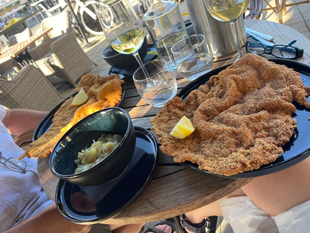 Another plan gone astray (gang aft agley), we opted for an excellent dinner at a place that had many GF options for me. Tonight there would be no chicken. I finally had SCHNITZEL! Weiner schnitzel to be precise. I don’t think I’ve had any since before I was diagnosed. It was delicious – and HUGE. Complemented with Slovak potato salad (lots of onions) and an excellent local wine – probably from a winery we drove by. A final stroll along the river past all the river cruise ships and it was time to call it a day.