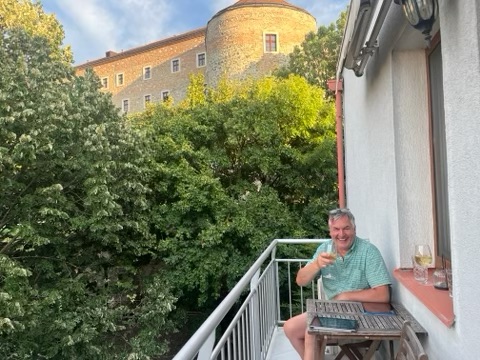 Along the way we made a short detour to Devin Castle – another supposedly “not to be missed” sight here. It is a ruin at the top of a hill and costs €8 to visit. We decided to pass: we have lots of castle ruins in Scotland, many very close to our house. We didn’t need to schlep up a hill in the heat to see a Slovak ruin. Instead we sat on our balcony enjoying an excellent bottle of €4 Slovak wine with a baguette slathered in local sheep cheese. Throw in some tomatoes for colour and it was a lovely lunch.