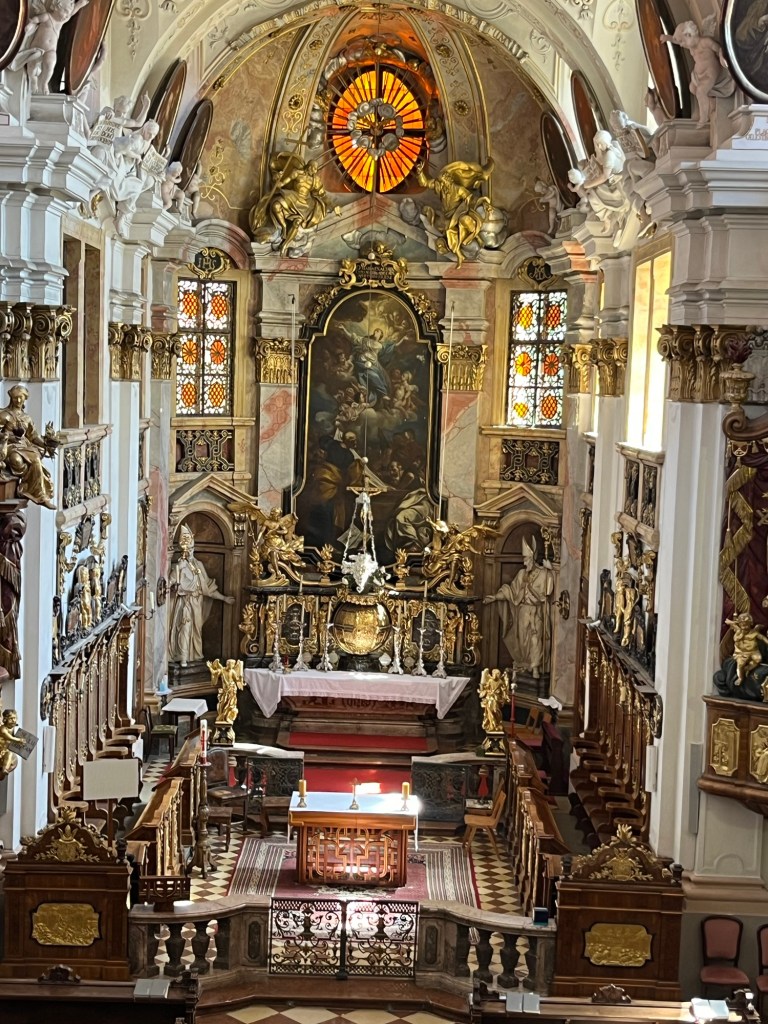 We had already toured one of the two blue Catholic churches when visiting Dürstein so we needed to complete the set and visit this one as well. Google insisted it was open from 17.30-18.30 so we waited with about a dozen other travelers to see the inside. The clock struck the half hour…. And nothing happened. The front doors were open but with metal gates across the entry saying: the church is closed. Grrrr. Stupid Google.