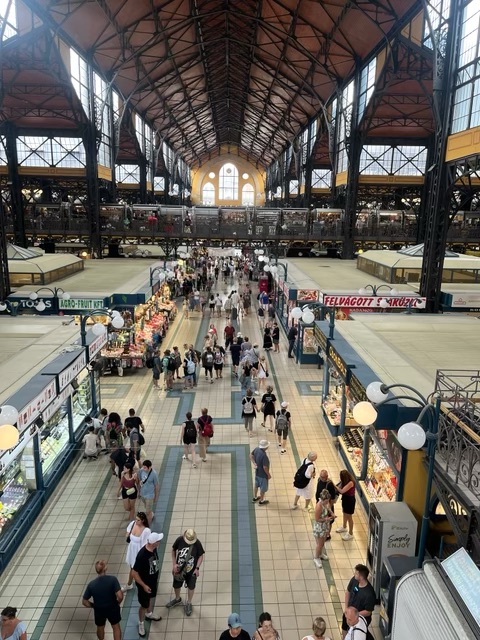 And the first thing we think of is sleeping late. Well late for us which is actually about 8.30. We made a ginourmous omelette with most of the remaining eggs and Slovak cheese. Then we decided to try visiting a real “local” market, one that doesn’t cater to tourists. A short bus ride took us to Lehel Market which had the same basic setup as the Central Market (food on the ground floor, other stuff upstairs). In this market there were no signs in English, massive stands of paprika, or Hungarian handicrafts. Just fruit, veg, meat, and clothing, shoes, and knock off designer bags. And lots of people doing their weekly shopping. And drinking beer. There was an inordinate number of people at the beer vendors for 10.30 in the morning!