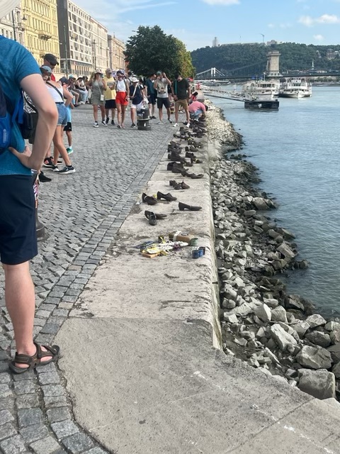 It was time to head to the river for another moving monument: Shoes on the Danube. We hopped on a bus and a tram to get to the riverside monument. These are iron versions of shoes that would have been worn by Jews in 1944 and 1945 as they were lined up on the bank and shot by the fascist Hungarian Red Arrow Party. There are candles and flowers and ribbons that adorn the various footwear and it is sad to be reminded of such a dark period in human history.