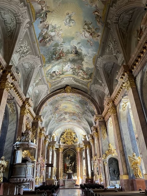 We had already toured one of the two blue Catholic churches when visiting Dürstein so we needed to complete the set and visit this one as well. Google insisted it was open from 17.30-18.30 so we waited with about a dozen other travelers to see the inside. The clock struck the half hour…. And nothing happened. The front doors were open but with metal gates across the entry saying: the church is closed. Grrrr. Stupid Google.