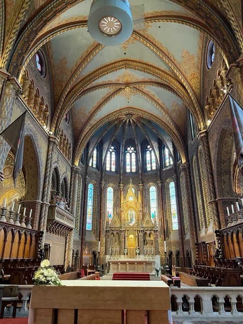 Wandering through all the construction was a bit of a challenge but we managed to get to the other main building of interest: the Matthias Church. Classical gothic architecture outside, amazing almost Moorish decor inside. It reminded me of some of the churches we visited in Spain several years ago. I couldn’t help but wonder if there was some influence from the 150 years of Turkish occupation in the decor. So no stained glass here but it definitely wasn’t necessary.