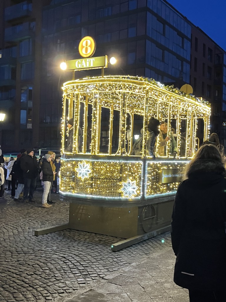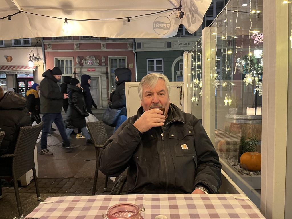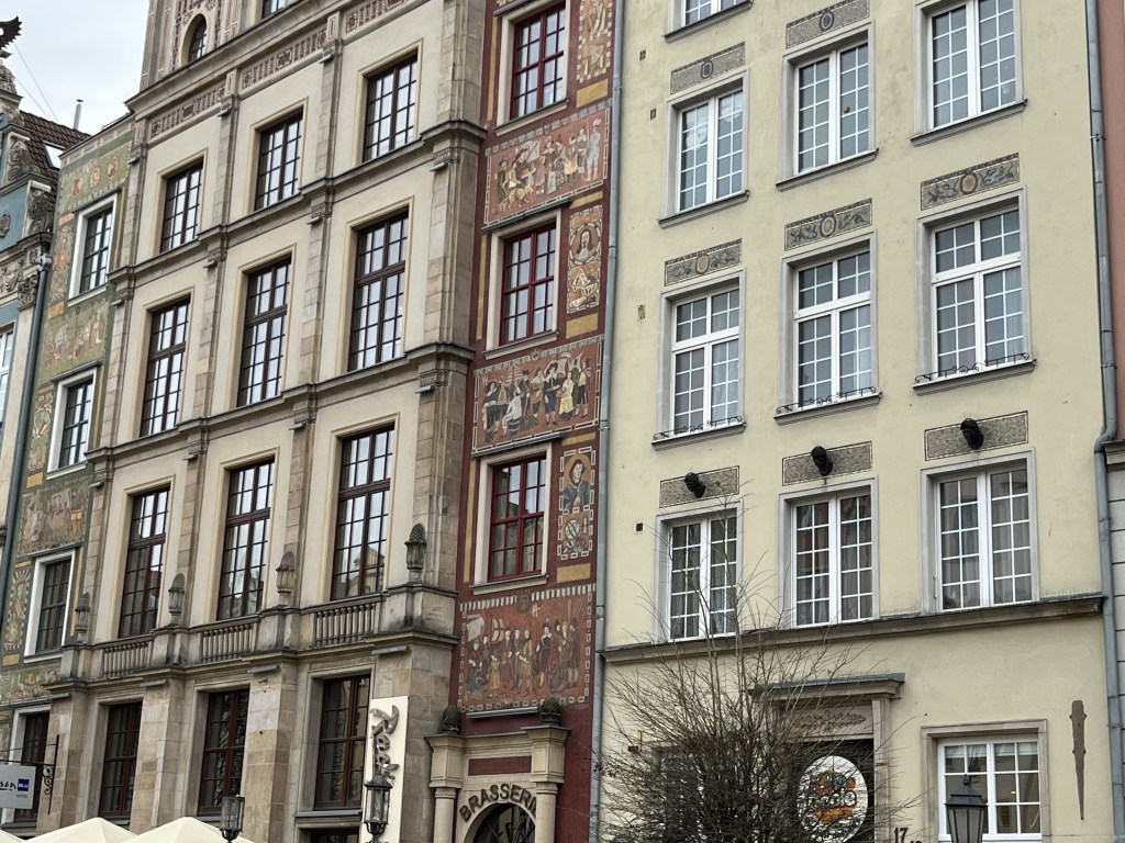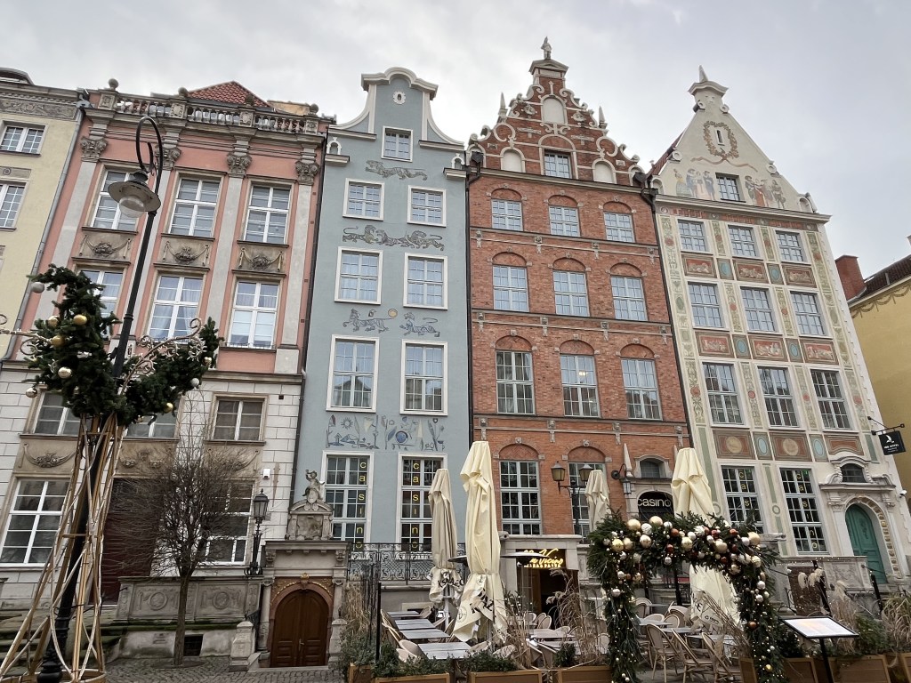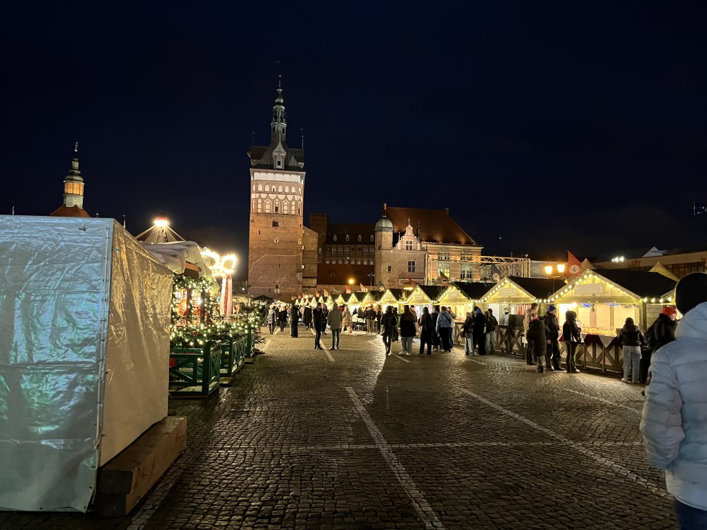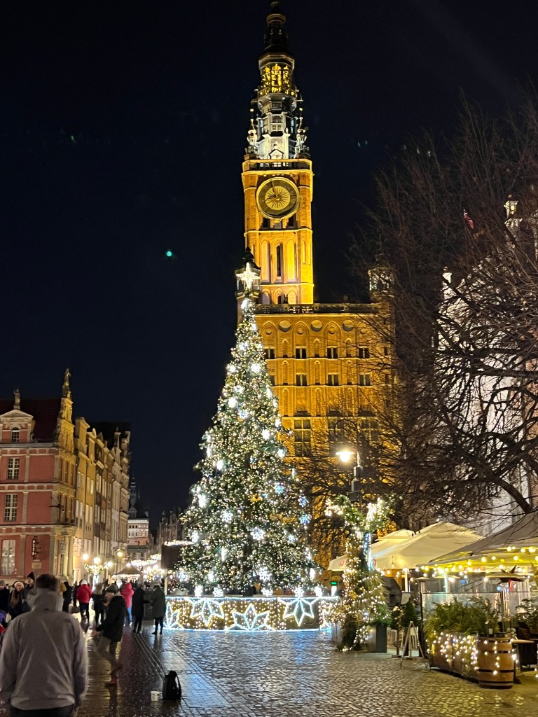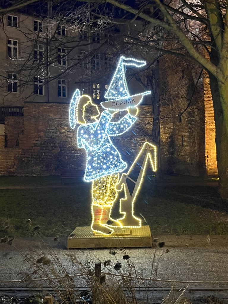 The next day was “walk around outside” day. The weather forecast was for sunshine with increasing wind on Sunday and a pretty miserable and rainy monday. So we laced up our boots and set off to walk around the city. It is a very pretty place, partly by design. Gdansk (or then Danzig) was a critical sight in WWII and was heavily bombed in 1945, destroying around 90% of the old city. Some parts were rebuilt in the prewar style of the 16-17th century. So we wandered around for about 25K steps. Part of that was a visit to the Christmas market. It is huge! Lots of mulled wine (yum!) and food stalls and tchotchkes and crafts and amber. LOTS of amber. There is even a museum for it here. Apparently Gdansk is the centre for Baltic amber.